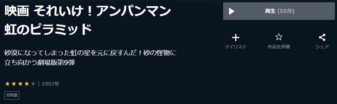 ご覧いただいたように、映画『それいけ!アンパンマン 虹のピラミッド』の動画は配信されておらず、無料で視聴することはできません。