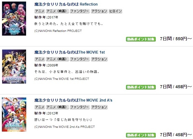 最初の30日間は無料でお試しすることができ、魔法少女リリカルなのはのシリーズ作品の動画の取り扱いも多数あります。