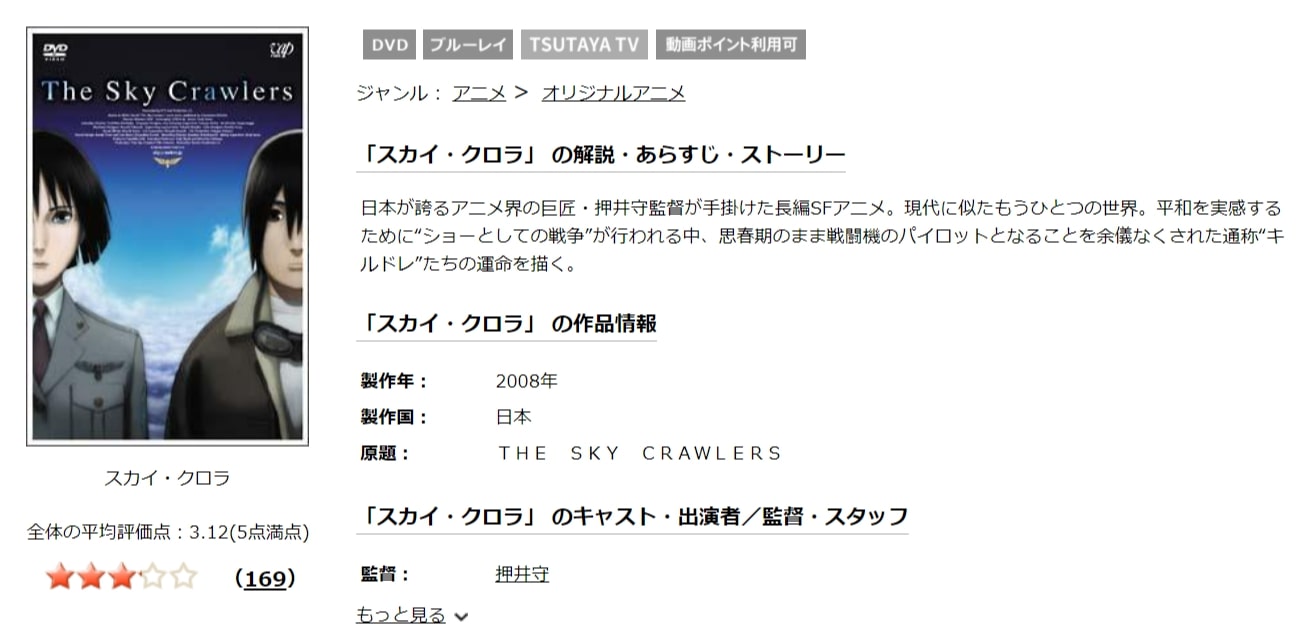 映画『スカイ・クロラ The Sky Crawlers』の動画をどこで見ようか迷っている人はぜひTSUTAYA DISCASをチェックしてみてください!
